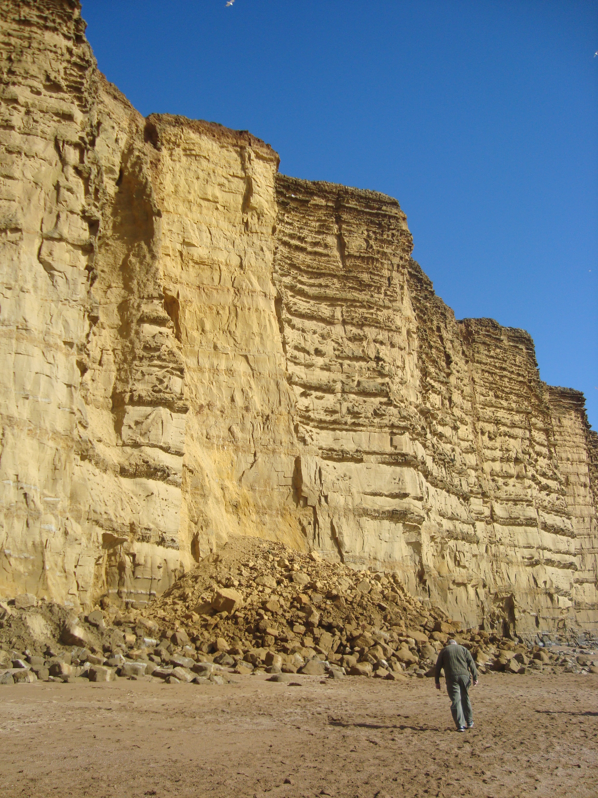 Walking along the beach we noticed right away the collapse along one part of the cliff. Not surprising considering the storms. I was stunned, however, when quickly scanning Sunday’s paper earlier this morning (always a day behind, as per) to see mention of West Bay, together with a photo not too dissimilar to mine, that this damage had only happened on Valentine’s night.