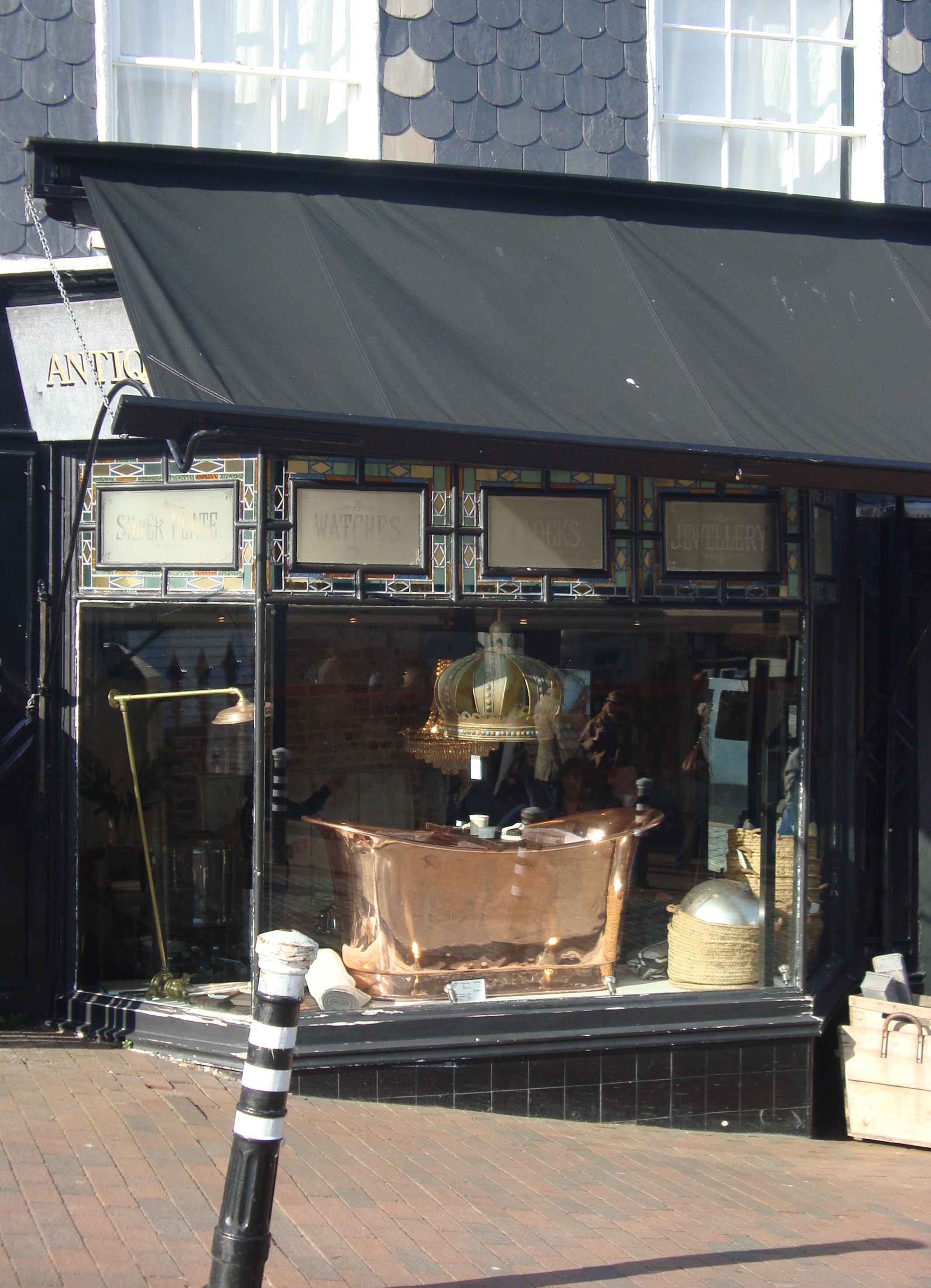 This window, you’ll agree I’m sure, is magnificent. Just look at that antique copper bath. It’s going for a cool £4,000. What’s that in dollars? A lot of money, that’s for sure!